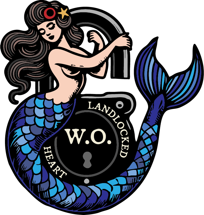 The Landlocked Heart logo features a hand-drawn mermaid wrapped around a traditional padlock, symbolizing strength, memory, and emotional restraint. Influenced by vintage tattoo art and maritime motifs, the design blends bold lines with fluid motion. The curved “Landlocked Heart” text reinforces its enclosed, iconic feel—balancing grit and grace to capture the project’s core tension.