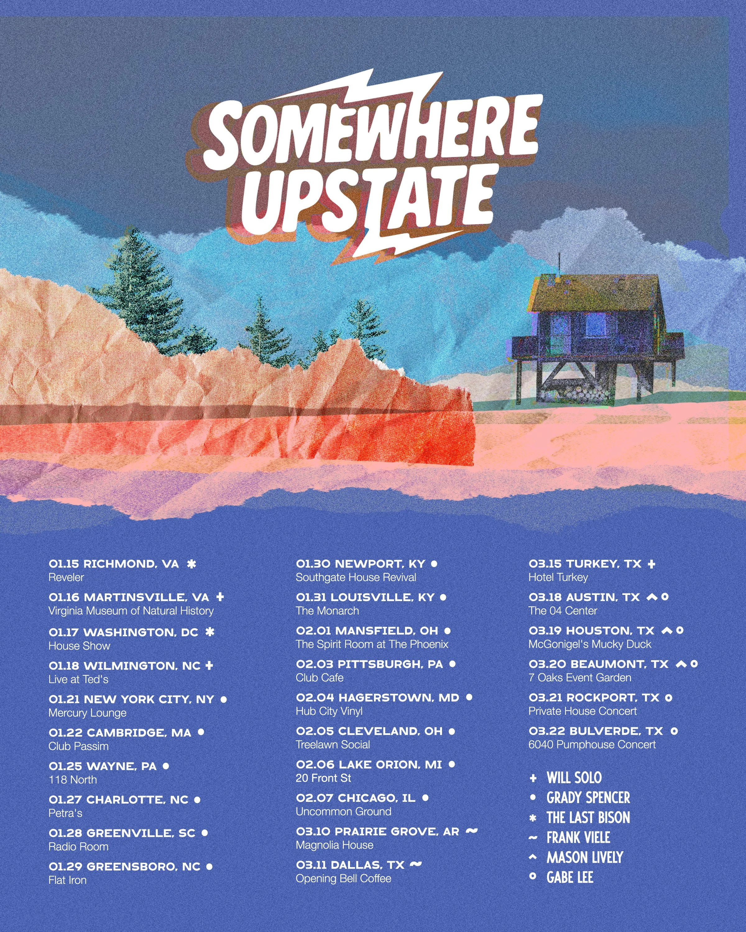 Custom tour icon designed for Will Overman and Grady Spencer’s Somewhere Upstate tour. The lightning bolts act as a visual bridge, symbolizing the coming together of two artists, two sounds, and two types of audiences into one shared experience. Built to function across tour posters and digital assets, the mark is bold, it’s adaptable, and recognizable.
